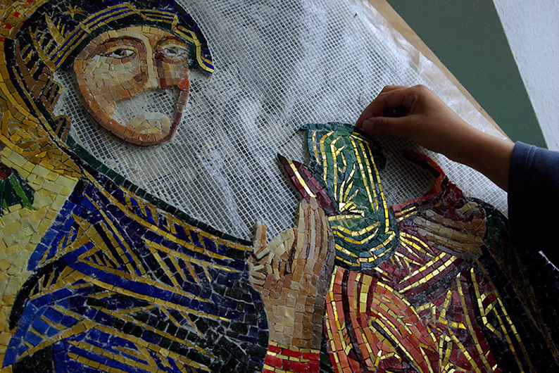 Jest to najbardziej atrakcyjny, trwały, ale również najdroższy materiał. Trwałość tej techniki pozwala nam podziwiać do dnia dzisiejszego sztukę mozaiki w najdalszych zakątkach ziemi. Dzisiaj również i Ty możesz radować się jej pięknem, w swej tradycji sięgającej czasów antycznych, drgającej tysiącami barw i tak wiernie oddającej duchowy wymiar sztuki sakralnej.
